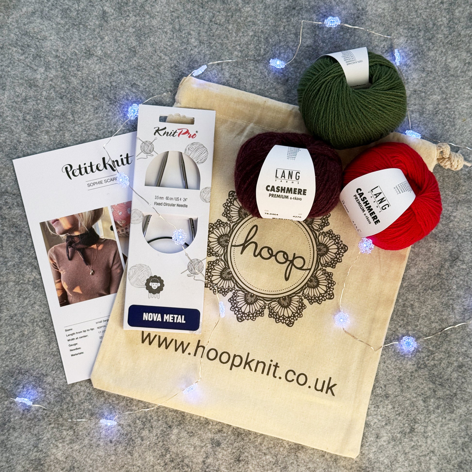 This kit contains everything needed to knit the Sophie Scarf. You'll receive a printed pattern for both small and large sizes, a Knitpro circular needle, Lang Yarns Cashmere yarn (one or two balls depending on your chosen size), and a printed Hoop project bag to store your materials. Simply choose your size and start knitting.