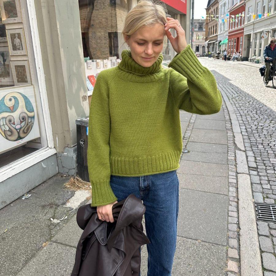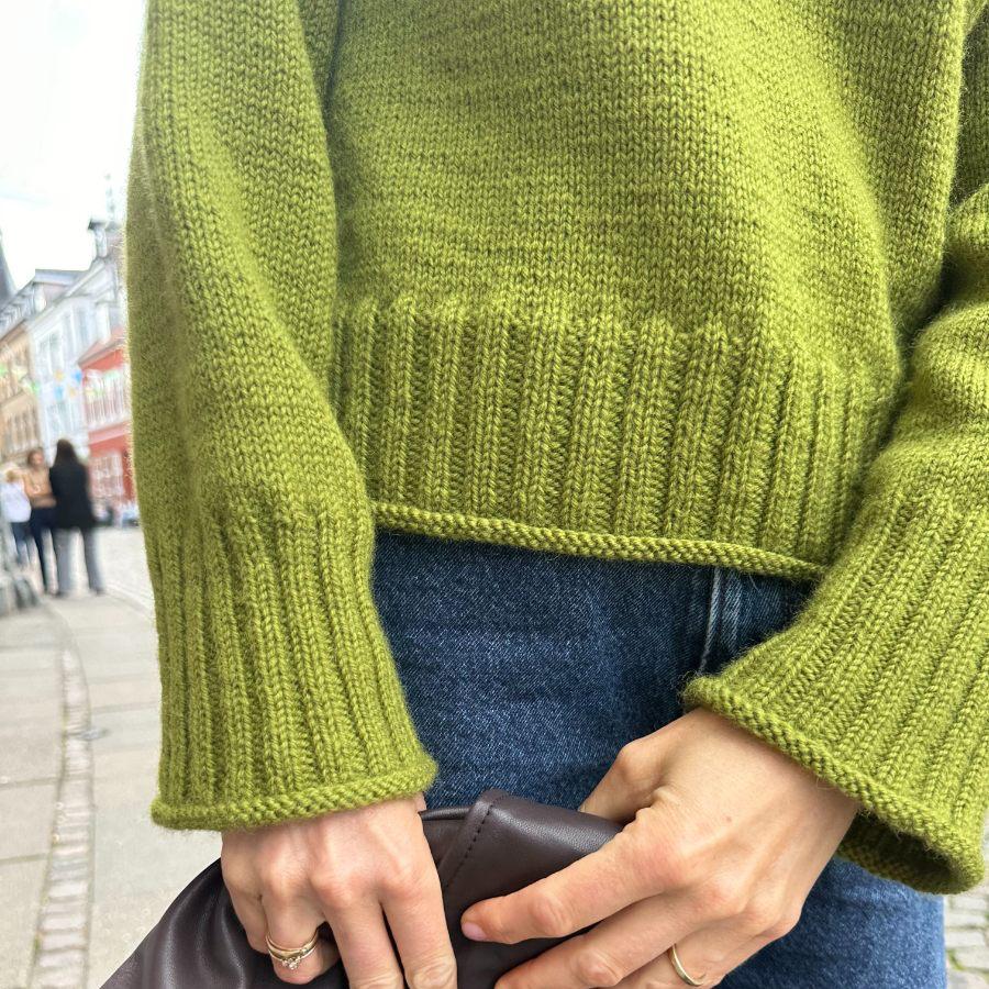 The Amy Sweater is worked from the top down in stocking stitch. The first part of the yoke is worked flat, back and forth, to shape the neckline. Then the work is joined in the round, so the rest of the yoke can be worked in the round and shaped with raglan increases. The sleeves and hem of the body are finished with wide ribbed edges followed by a small roll-over edge worked in stockinette stitch. The turtleneck collar is worked at the end, from stitches that are picked up and knitted around the neck opening.
