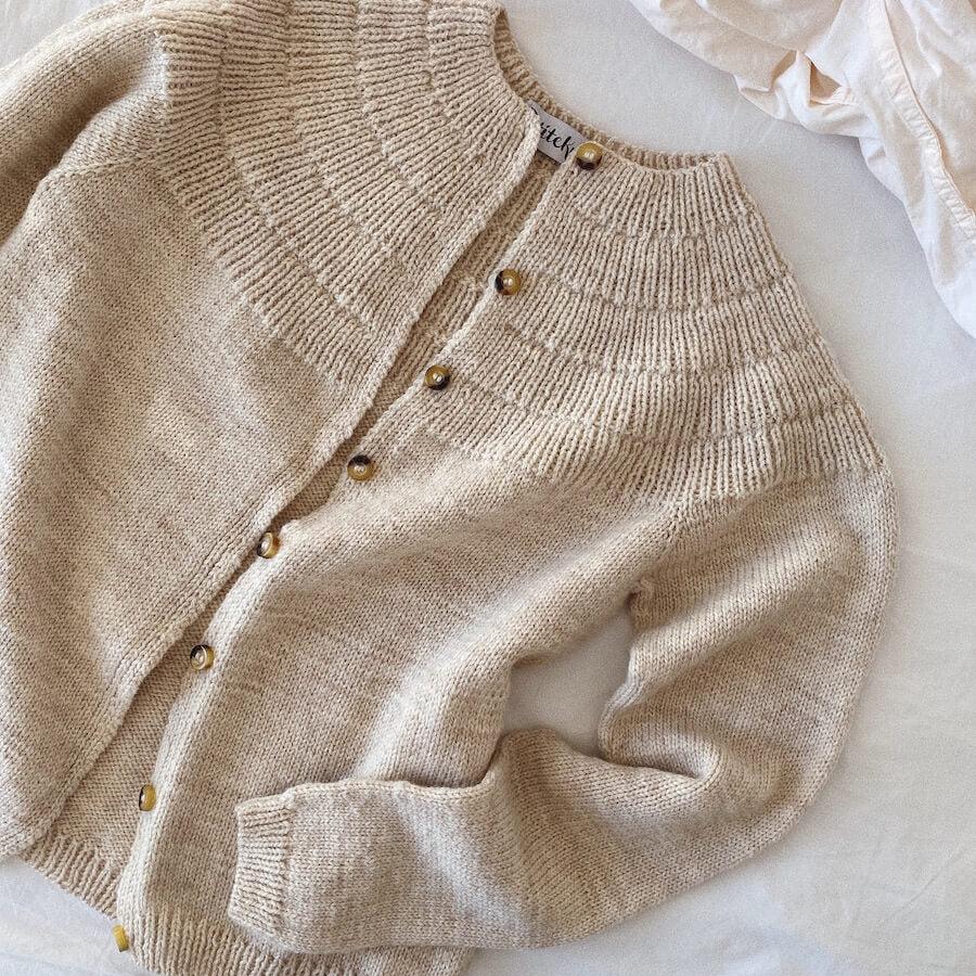 Anker’s Cardigan – My Size has a circular yoke worked in sections of rib with increases followed by classic raglan increases. The cardigan is worked from the top down and back and forth on a long circular needle. The sleeves are worked in double-pointed needles or on a circular needle using the Magic Loop technique. The first and last 7 sts on yoke and body are worked in rib for the front edges.