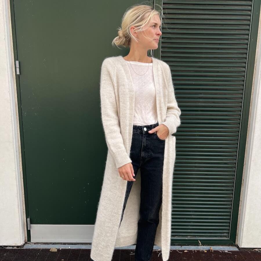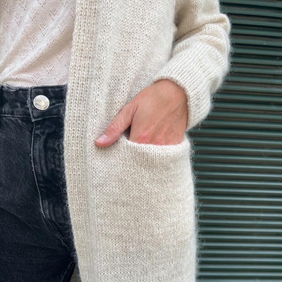 The No Frills Cardigan is a long cardigan that is worked from the top down with raglan increases. The cardigan is worked in stockinette stitch, while the neck edge is worked in rib which is continued down along the front edges. At the end, the afterthought pockets are worked from stitches that are picked up along the fronts of the cardigan.