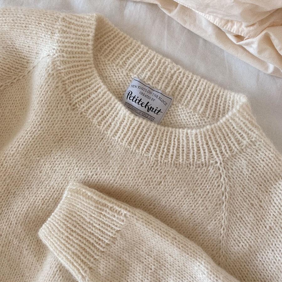 No Frills Sweater is a simple raglan sweater with neckline shaping at the front. The fit is slightly oversized, but the wide rib edges and the shorter length give the sweater a feminine silhouette. The No Frills Sweater is worked from the top down, which makes it easy to try it on along the way, so you can customise it to fit your body and end up with the perfect sleeve and body length for you. If you want to make sure that the rib neck edge keeps it shape over time, you can sew a thin elastic thread along the edge.
