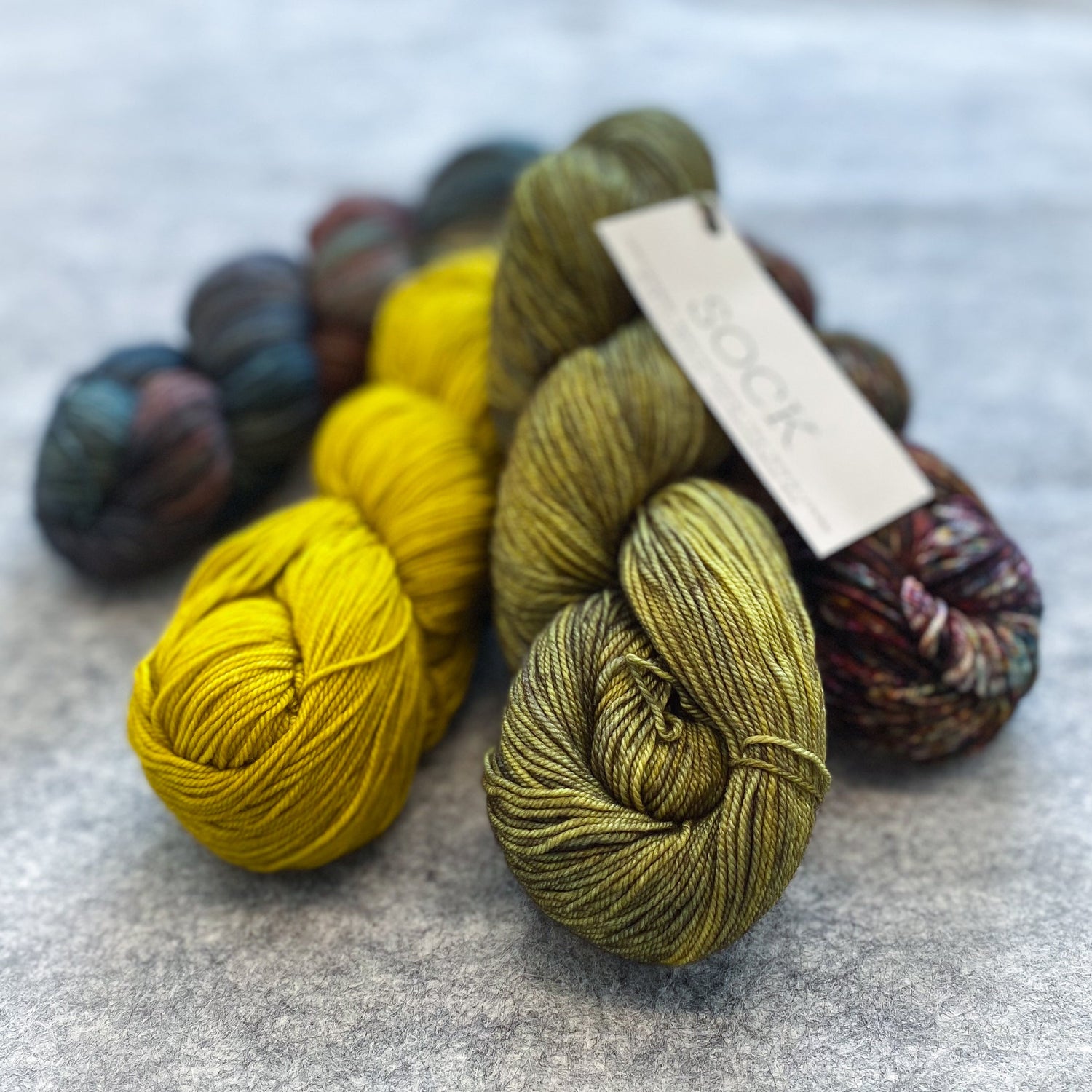 I did some stash diving to find the perfect colours and luckily I had 5 great shades of handdyed sock yarn that worked perfectly together - In this shawl I'm using some Pigment and Ply, LITLG, and some West Green Loft Yarns