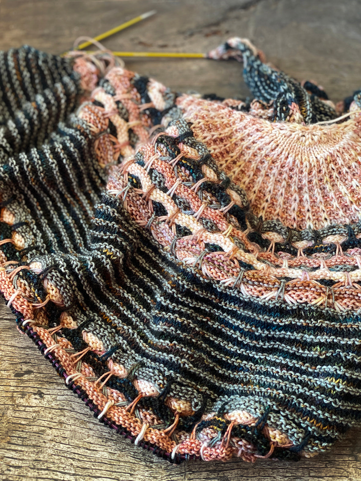I'm thoroughly enjoying this project as it features some slip stitch mosaic and cables as well as some soothing rows of garter stitch. I'll look forward ro showing it off in the shop very soon.